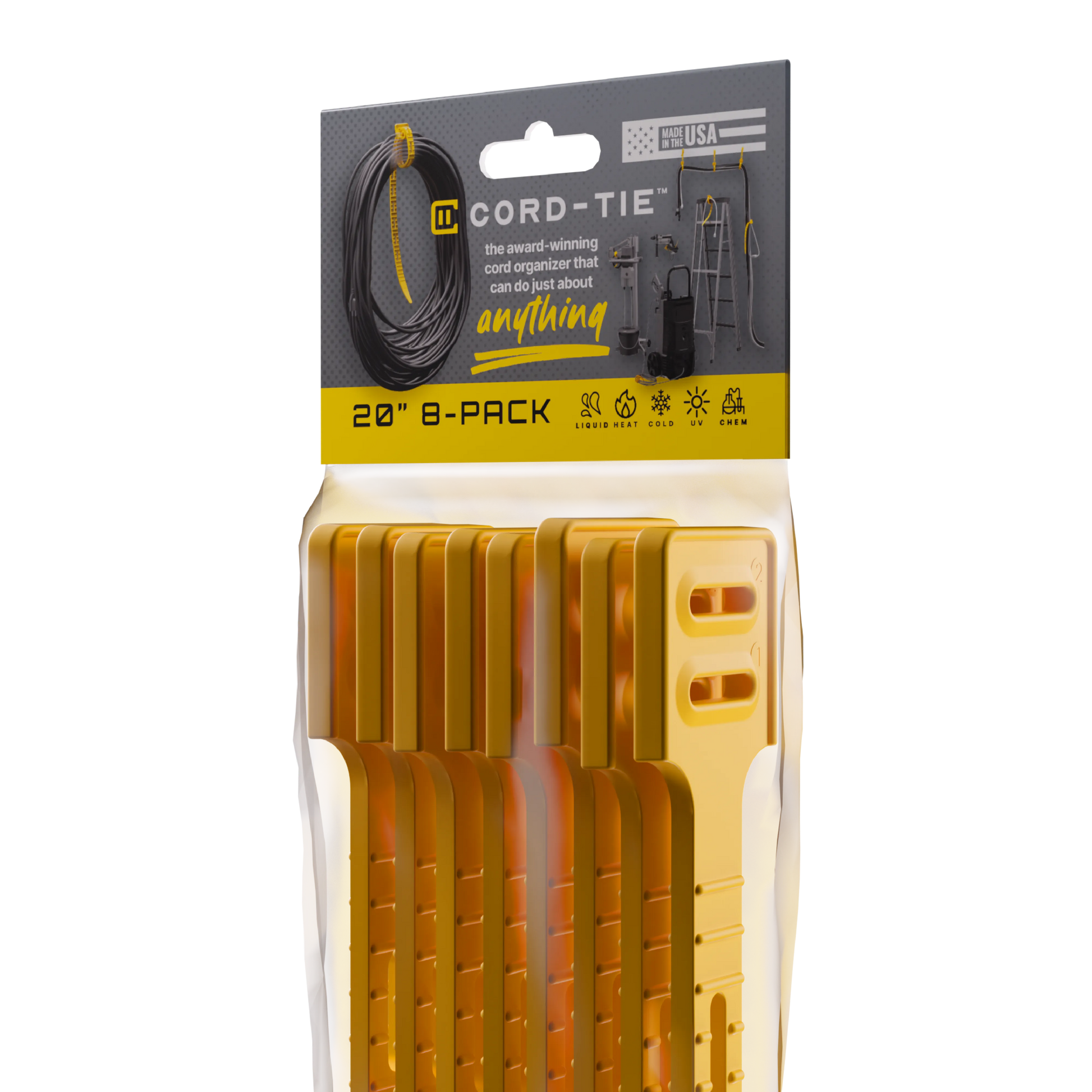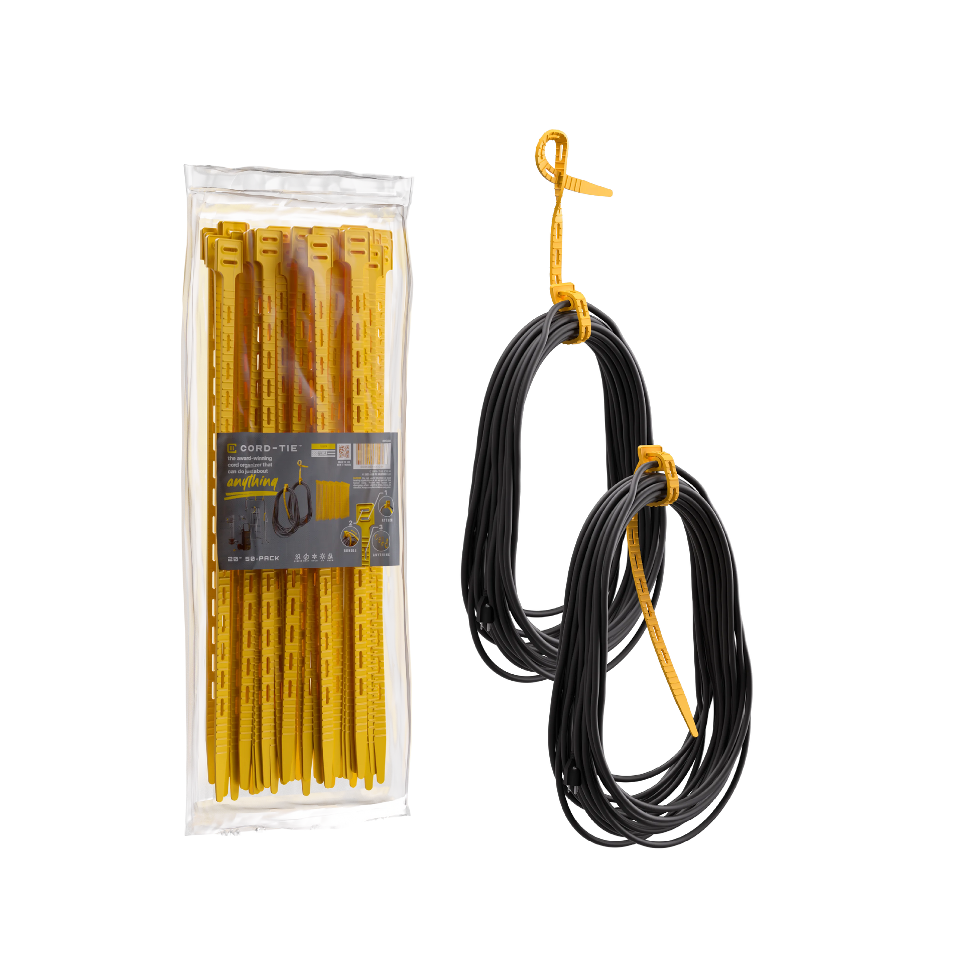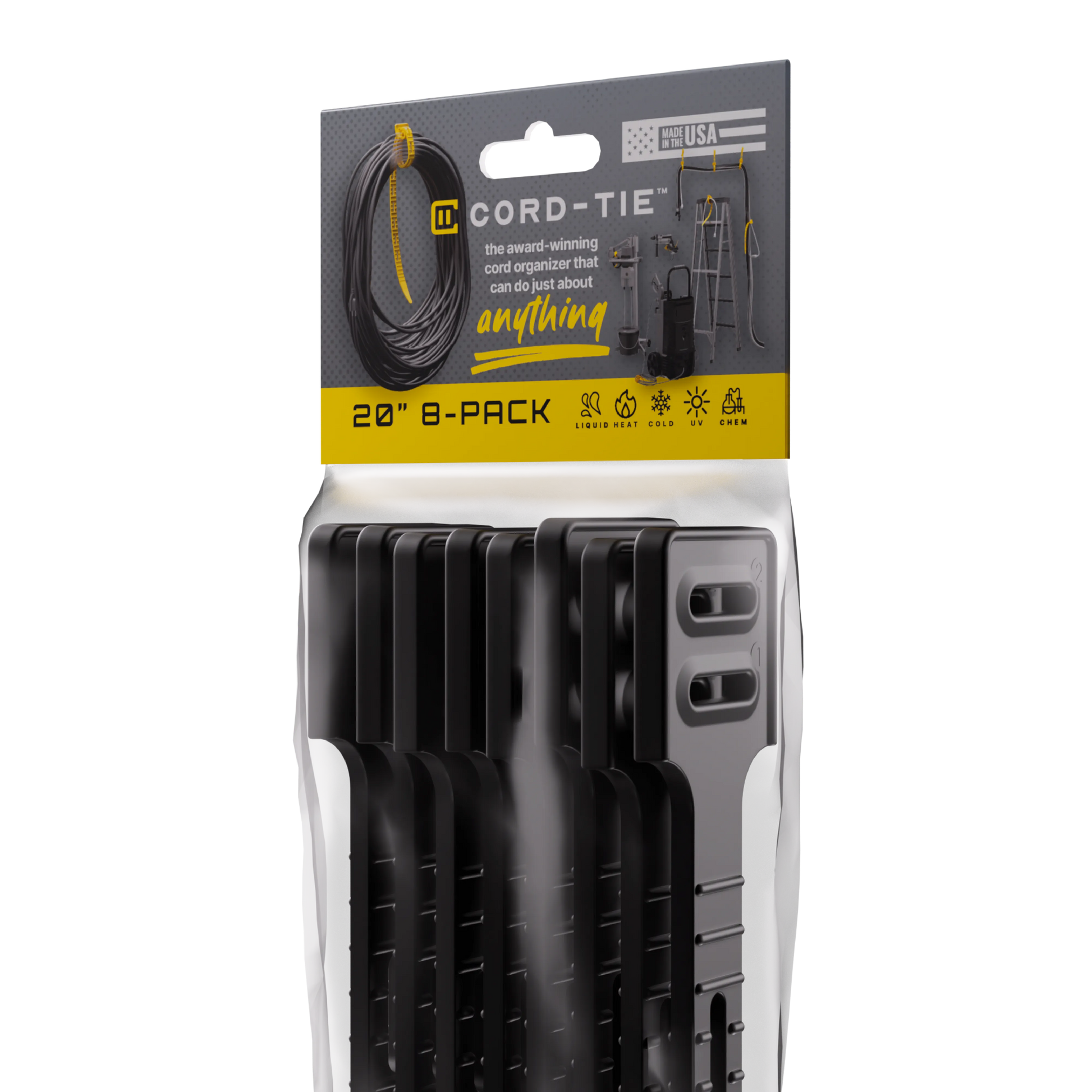 Cord-Tie is made from a custom-engineered thermoplastic elastomer (TPE)—a flexible, high-memory polymer that combines the stretch of rubber with the strength of plastic.